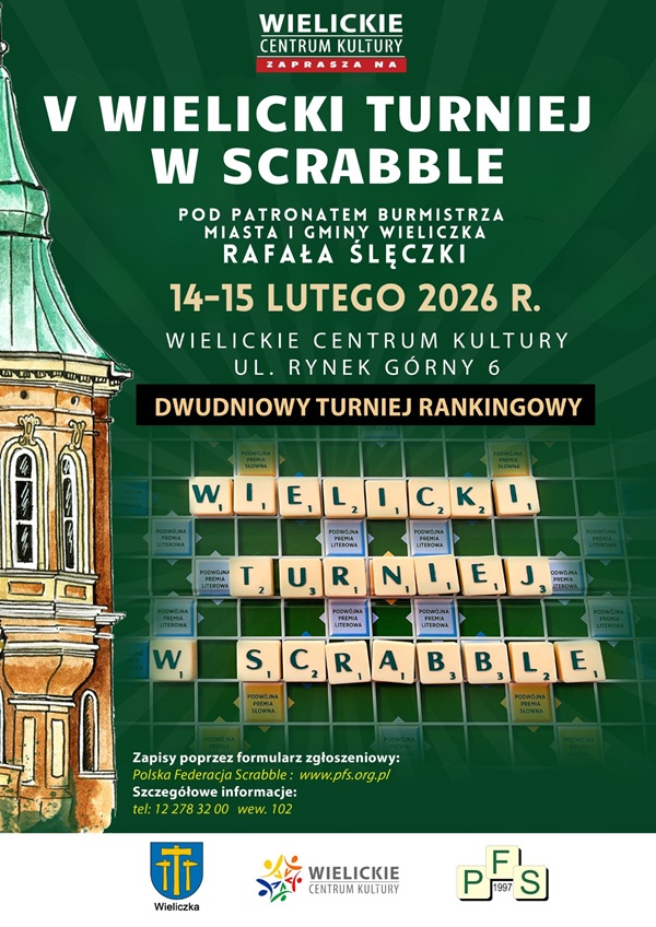 W dniach 14–15 lutego 2026 roku odbył się V Wielicki Turniej w Scrabble pod Patronatem Burmistrza Miasta i Gminy Wieliczka Rafała Ślęczki. Miejscem rywalizacji – tradycyjnie już – było Wielickie Centrum Kultury. To właśnie tam po raz kolejny spotkali się zawodnicy z różnych stron Polski, by przez dwa dni zmagać się przy planszach. Turniej oficjalnie otworzył Dyrektor WCK, Filip Banaś, życząc uczestnikom udanej i sportowej rywalizacji. W kuluarach dało się również usłyszeć zainteresowanie pana Dyrektora cyklem Grand Prix, co pokazuje, że scrabble w Wieliczce budzą ciekawość nie tylko uczestników, ale i gospodarzy wydarzenia.