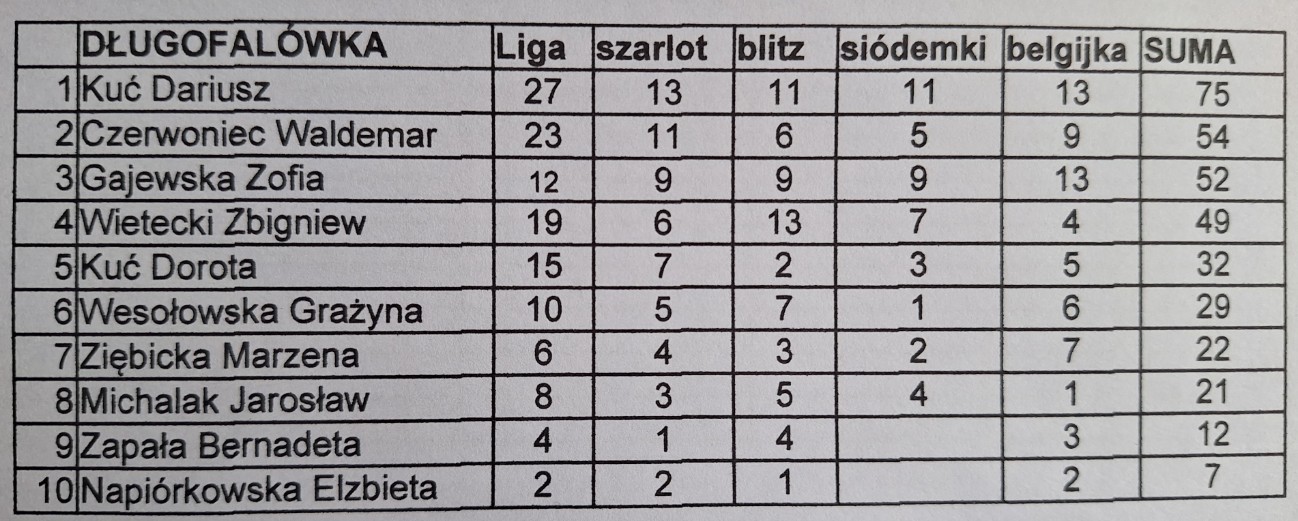 W skróconym do sześciu dni pobycie udało się sprawnie rozegrać pojedynki ligowe systemem "każdy z każdym" (mecz i rewanż), belgijkę, turnieje "siódemek" i 10-minutowego blitza oraz "szarlotkę". W ostatnich dwóch edycjach "WiP" triumfował Dariusz Kuć. W tym roku ponownie stargardzki Gucio całkowicie zdominował towarzystwo zwyciężając z dużą przewagą w klasyfikacji długofalowej (szczegóły w załączniku). Choć inauguracyjny niedzielny turniej blitza wygrał Zbyszek Wietecki przed Darkiem i Zosią Gajewską, w następnych konkurencjach ten drugi już nie zszedł z pierwszego miejsca podium. Tylko w belgijce podzielił się zwycięstwem z Zosią Gajewską (tu Waldek Czerwoniec zajął trzecie miejsce). W szarlotce drugi dla odmiany był Waldek, trzecia Zosia, a w "siódemkach" za Darkiem uplasowali się Zosia i Zbyszek. Stała trójca, hę! Ligę "oczywiście" wygrał i królem wczasów zasłużenie został — Dariusz KUĆ! Przybył mu trzeci pucharek do kolekcji i nagroda — kryminalna trylogia z Oslo Jo Nesbø (moim zdaniem najbardziej fascynująca część opowieści o wyczynach genialnego śledczego Harry'ego Holle). Upominki książkowe i pamiątkowe znaczki scrabblowe otrzymali wszyscy uczestnicy.